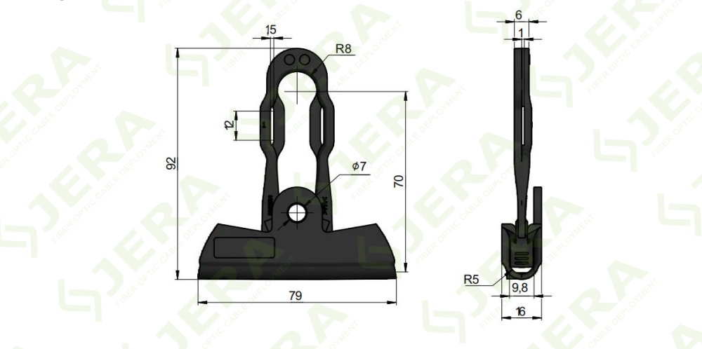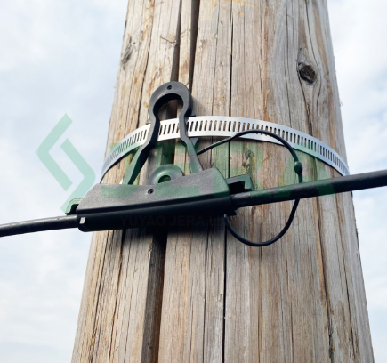 FTTH drop cable suspension clamp PS-M also called PSR FO D58 clamp used to suspend and fix round or flat fiber optic cable on pole or cross-arm during outdoor aerial FTTx line deployment.