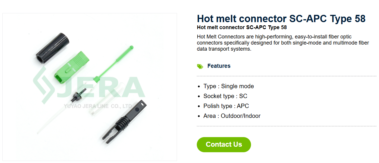 Hot melt connector SC-APC Type 58 popularity began in data centers, where single-mode fiber is used and the number of connections is very large, so the cost of the welding machine pays off quickly, and the speed of connection creation is a real cost advantage. The cost of welding machines is approaching the cost of a set of mechanical connectors, so it has become easier to make a financial decision in favor of using SOC." The performance of Hot melt connector SC-APC Type 58 is much higher than that of pre-polished/spliced (mechanical) connectors simply because fusion splicing is superior to mechanical splicing, and the cost of SoCs is much lower because there is no complex mechanical splicing in the connector.