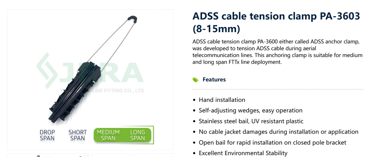 The PA-3603 is specifically designed for ADSS optical fiber cables in aerial telecommunication lines. Its installation process centers on secure cable fixation, correct force application, and compatibility with ADSS cable characteristics.